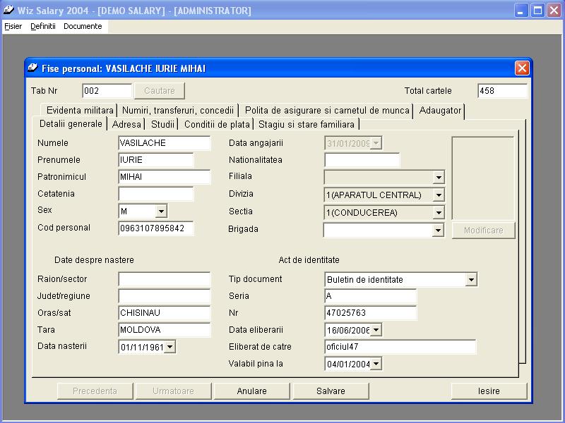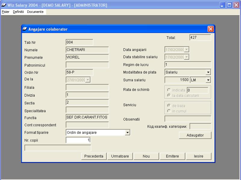 • Functia de generare a documentelor (ordine de angajare, transfer, modificare conditii de plata, ordine aditionale, de concediu, deplasare s.a.m.d.);